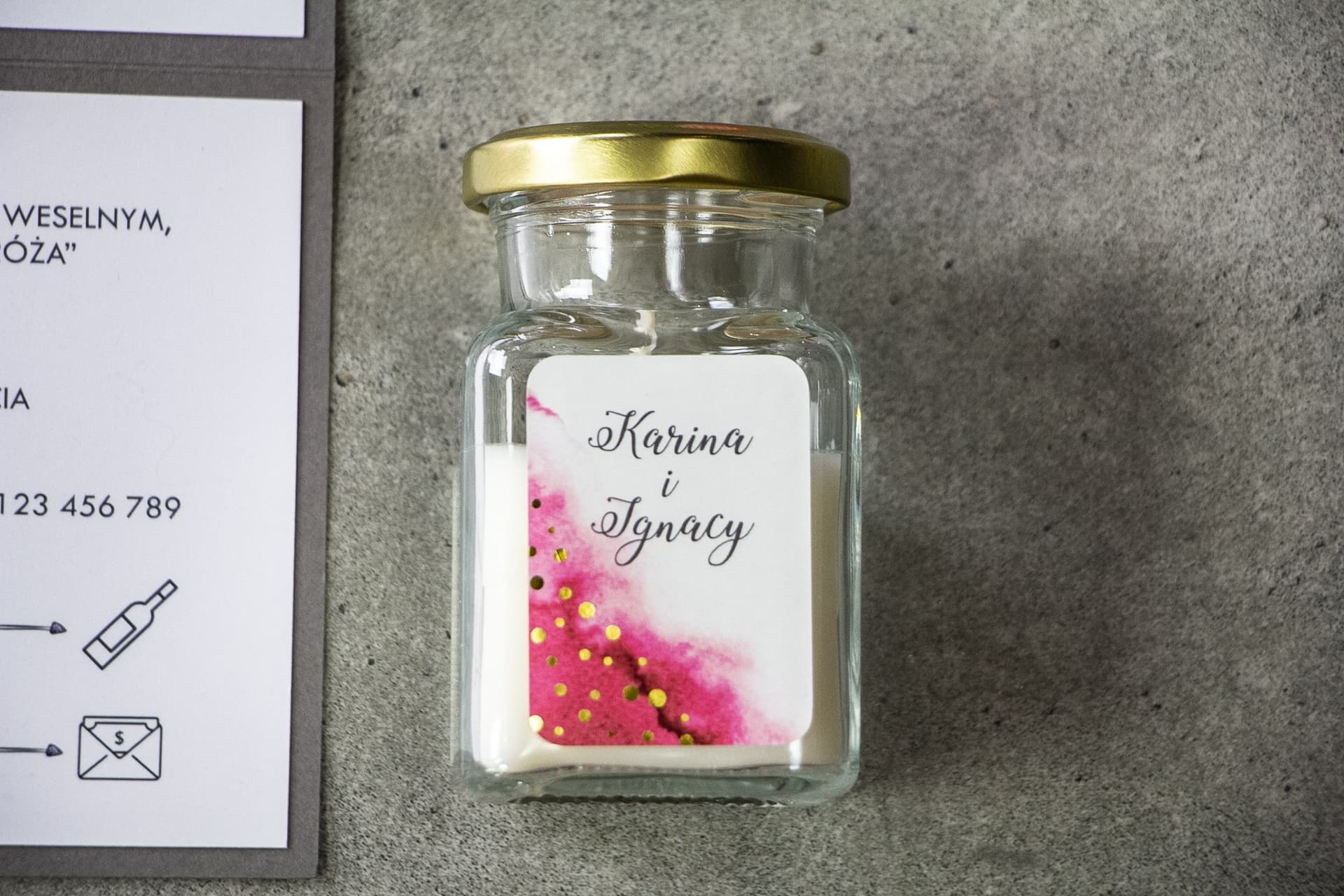 Podaruj swoim gościom wyjątkowe podziękowanie – elegancką świeczkę zapachową w szkle z personalizowaną etykietą. Subtelny róż, złote detale i wybrany przez Ciebie aromat stworzą niezapomnianą pamiątkę z Waszego dnia. To idealny, pachnący upominek, który pięknie ozdobi stoły weselne i zachwyci bliskich. Zapewniamy darmowy projekt i pełną personalizację, aby idealnie dopasować świeczki do stylu Waszej uroczystości. Stwórzcie coś wyjątkowego i zamówcie już dziś!