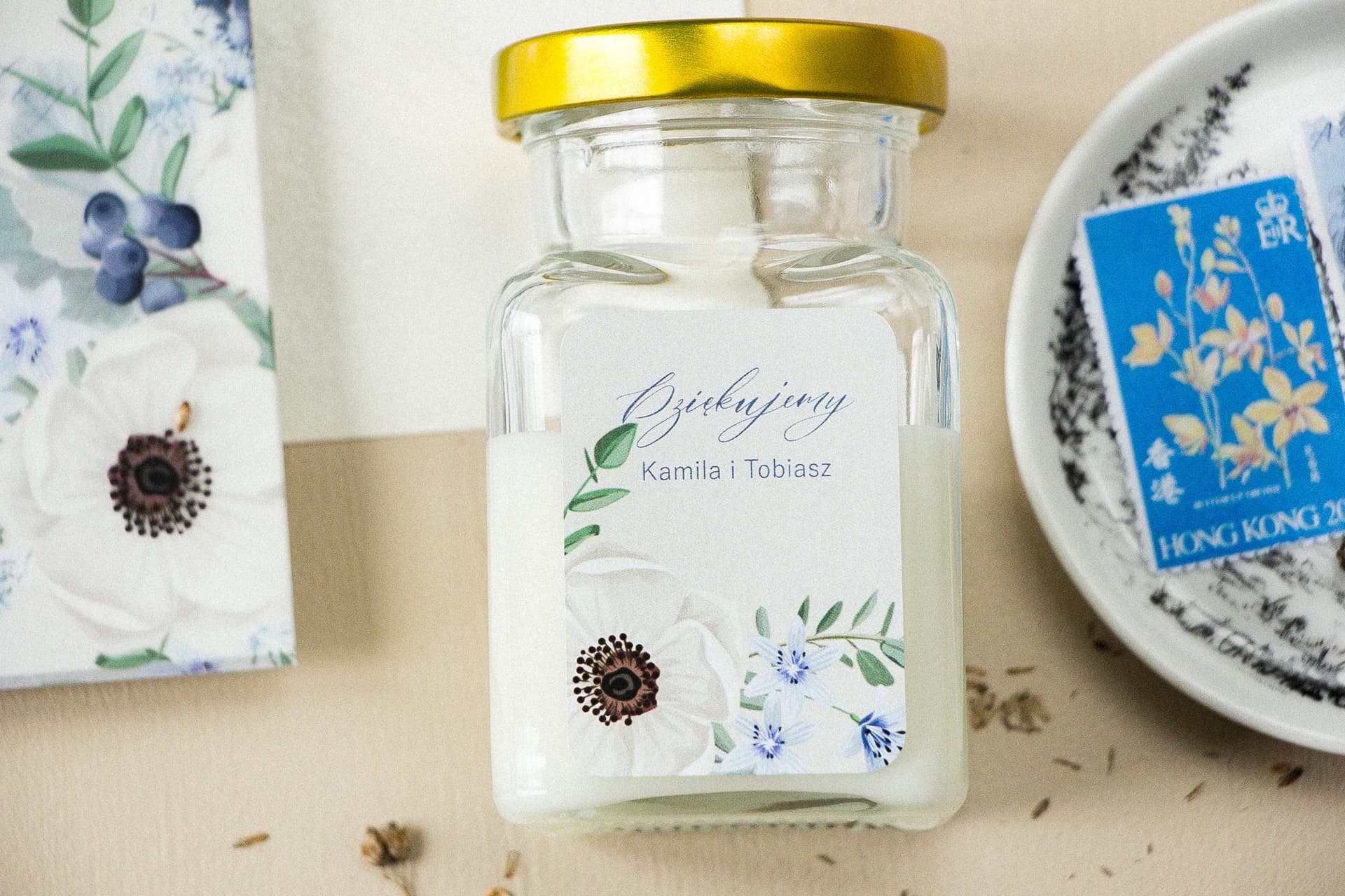 Podaruj swoim bliskim wyjątkowe podziękowania dla gości weselnych – eleganckie świeczki zapachowe w szkle z motywem białych zawilców. Każda świeczka, ozdobiona personalizowaną etykietą i złotą zakrętką, stanowi piękną i trwałą pamiątkę Waszego dnia. Wybierz jeden z dostępnych, urzekających zapachów, aby stworzyć upominek idealnie dopasowany do Waszej uroczystości. To nie tylko dekoracja stołu, ale gest, który goście zapamiętają na długo. Zamów teraz i zachwyć swoich gości niepowtarzalnym detalem!