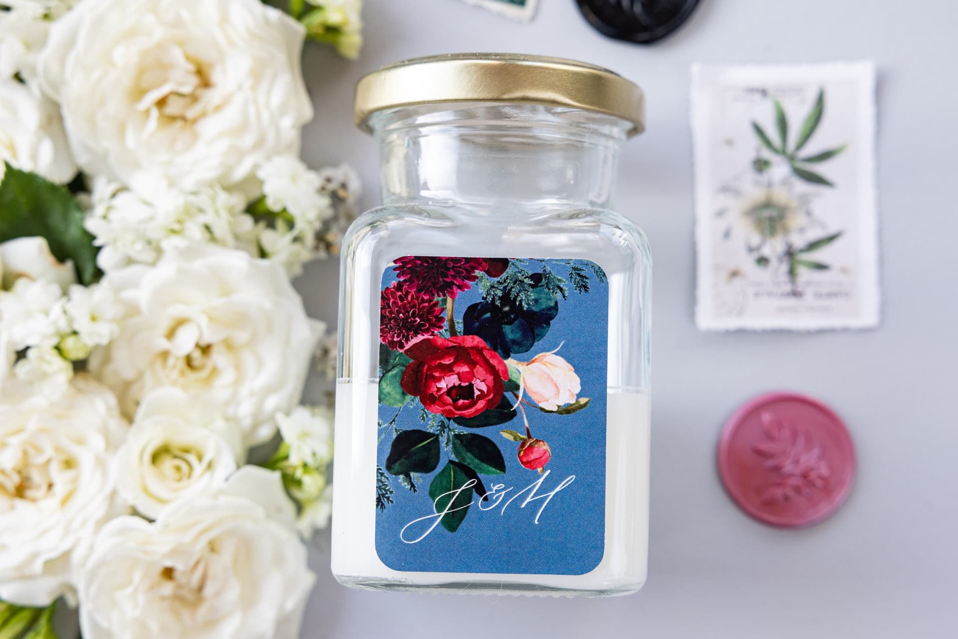 Estetyka jest kluczem do spójnej i zachwycającej oprawy weselnej. Etykieta świeczki z kolekcji Soft Nr 6 to małe dzieło sztuki, które idealnie wpisuje się w najnowsze trendy ślubne. Dominujący, niezwykle modny kolor dusty blue, czyli przygaszony, subtelny błękit, stanowi doskonałe tło dla bogatej kompozycji kwiatowej. Królują w niej burgundowe i różowe piwonie – symbol miłości i szczęścia – oraz delikatne dalie. Taka paleta barw jest nie tylko elegancka, ale również bardzo uniwersalna. Pasuje zarówno do wesel w stylu glamour, jak i rustykalnych, nowoczesnych czy romantycznych. Motyw kwiatowy to klasyka, która nigdy nie wychodzi z mody i zawsze dodaje uroczystości szlachetności.
