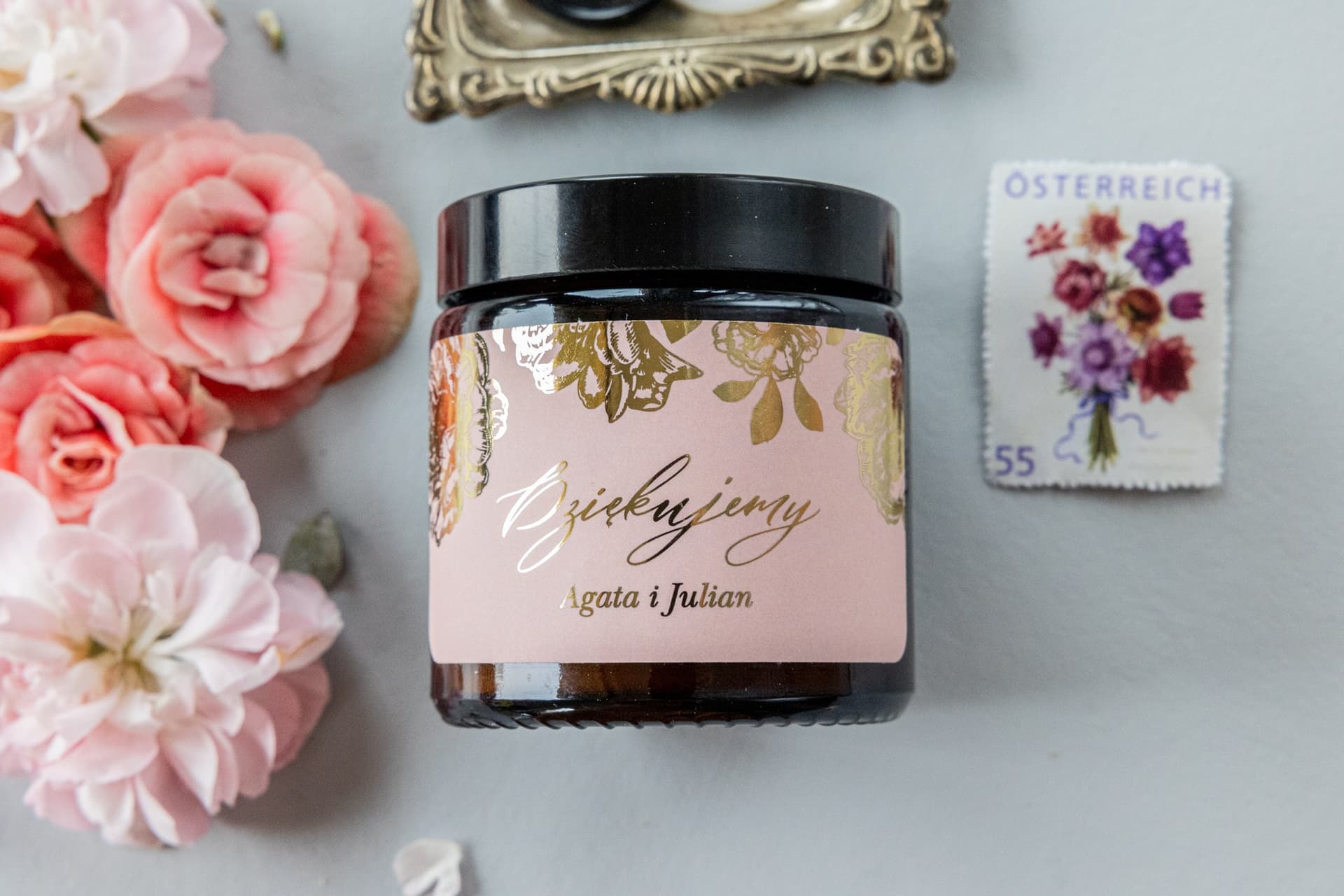 Szukasz eleganckich podziękowań dla gości w stylu glamour? Nasze naturalne świeczki sojowe z różową etykietą i złoconą grafiką piwonii to niezapomniany upominek. Każda świeca, wykonana ręcznie ze 100% wosku sojowego, zamknięta jest w stylowym słoiczku z brązowego szkła, gwarantując ponad 15 godzin palenia i piękny zapach. Dzięki pełnej personalizacji i darmowemu projektowi stworzysz unikalną pamiątkę, która zachwyci Twoich bliskich. Sprawdź i zamów w Amelia-Wedding.pl, by dodać Waszemu dniu odrobinę luksusu!