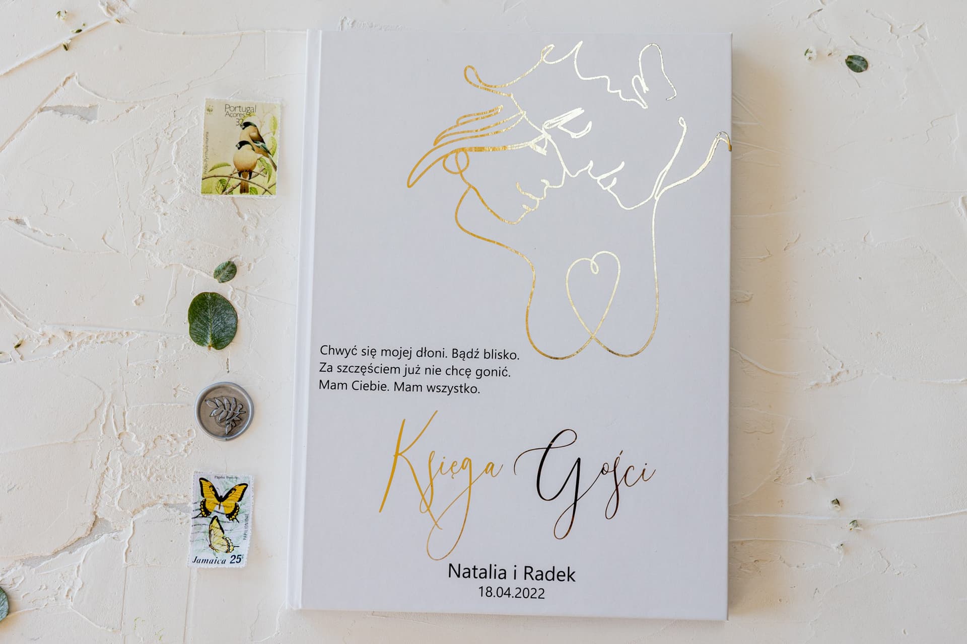 Oczywiście! Personalizacja obejmuje Wasze imiona oraz datę ślubu, które wykonujemy elegancką, złoconą czcionką. Grafika dłoni i serca jest stałym elementem tej kolekcji, ale jeśli macie indywidualny pomysł, zapraszamy do kontaktu – chętnie tworzymy projekty na specjalne zamówienie.