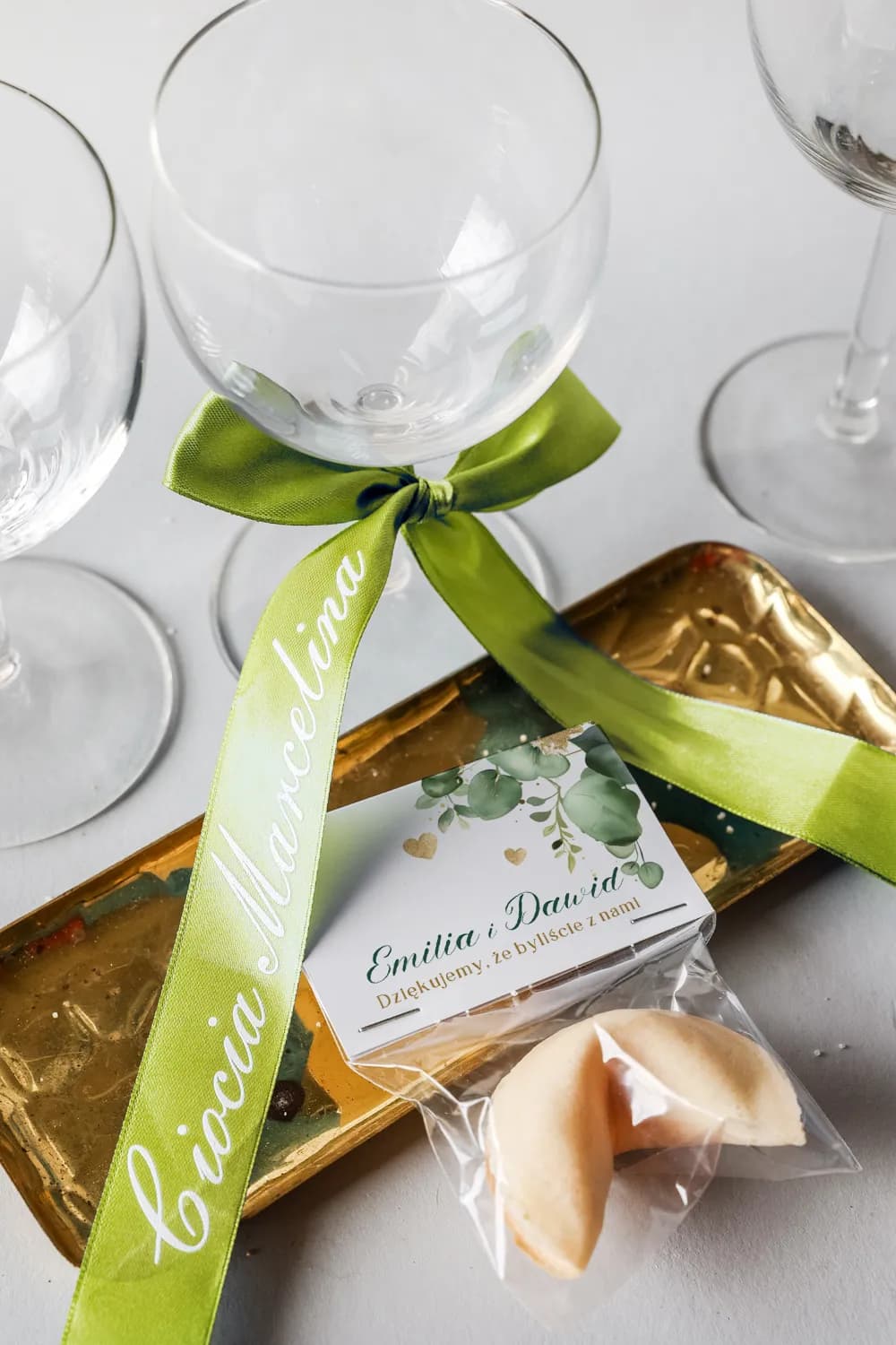 Metrowa długość i szerokość 25 mm dają Ci nieograniczone pole do popisu. Te winietki na tasiemce możesz finezyjnie zawiązać na nóżce kieliszka, tworząc elegancką dekorację, która zachwyci gości już na pierwszy rzut oka. Innym pomysłem jest owinięcie nimi lnianych lub bawełnianych serwetek, co stworzy piękny, rustykalny akcent. Możesz je również dołączyć do drobnych upominków dla gości, tworząc spójny i personalizowany podarunek, który na długo pozostanie w ich pamięci. Ta wszechstronność sprawia, że są one jednym z najbardziej kreatywnych dodatków na weselnym stole.