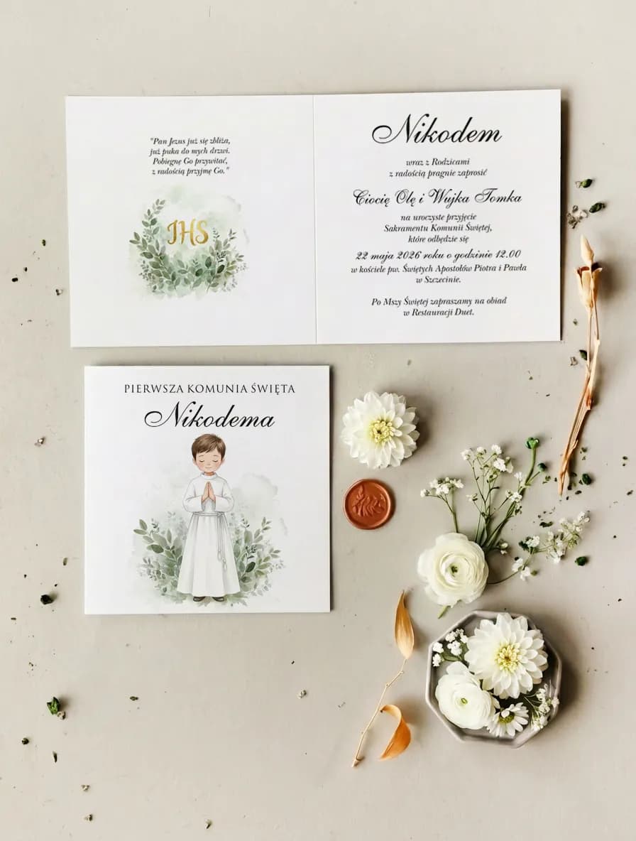 To zaproszenie komunijne z ilustracją chłopca, które wielu rodziców wybiera właśnie ze względu na jego spokój oraz subtelność przekazu.
