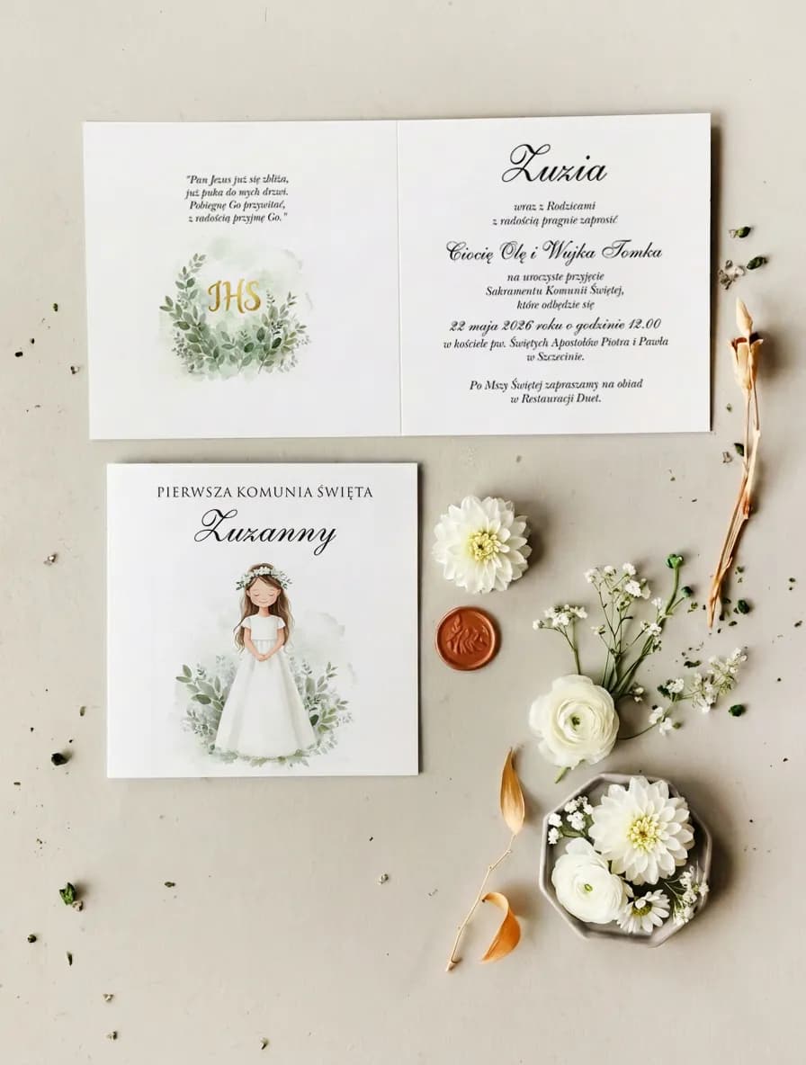 Zamów zaproszenia komunijne z ilustracją dziewczynki. Projekt i poprawki zawsze bez dodatkowych opłat.