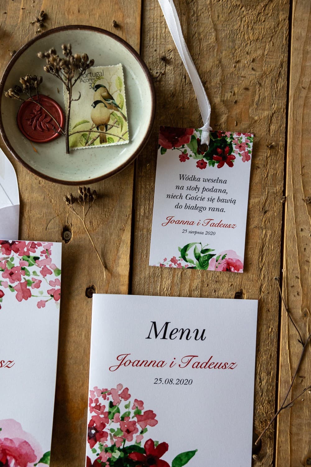 Zawieszki na alkohol to tylko jeden z elementów, który może uświetnić Wasze przyjęcie. Pomyślcie o efekcie, jaki stworzycie, decydując się na całą gamę dodatków z tym samym, pięknym motywem bordowych kwiatów. W kolekcji Kalia nr 11 znajdziecie również winietki na stół, menu weselne, numery stołów, a nawet podziękowania dla gości. Taka spójność wizualna świadczy o profesjonalnym podejściu do organizacji i z pewnością zostanie zapamiętana. Niezależnie od tego, czy planujecie huczne przyjęcie, czy kameralne przyjęcie weselne w domu, dbałość o detale zawsze robi wrażenie.