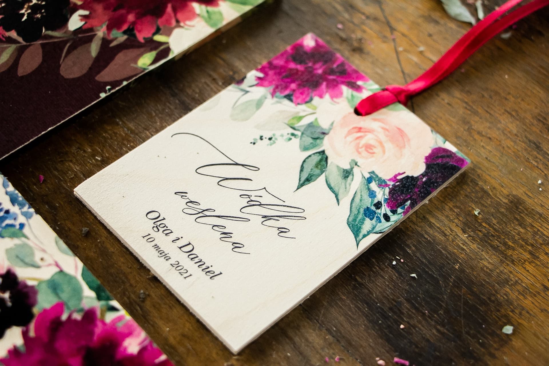 Odkryjcie nasze wyjątkowe, drewniane zawieszki na alkohol z kolekcji Topaz nr 3. Wykonane z naturalnej sklejki, ozdobione przepięknym nadrukiem różowych róż i piwonii na burgundowym tle, stanowią idealny dodatek do wesela w stylu rustykalnym, boho czy kwiatowym. Te personalizowane zawieszki na wódkę weselną to nie tylko elegancka dekoracja butelek, ale również urocza pamiątka dla gości. Zaskoczcie wszystkich dbałością o detale i stwórzcie spójną aranżację Waszego wymarzonego dnia.