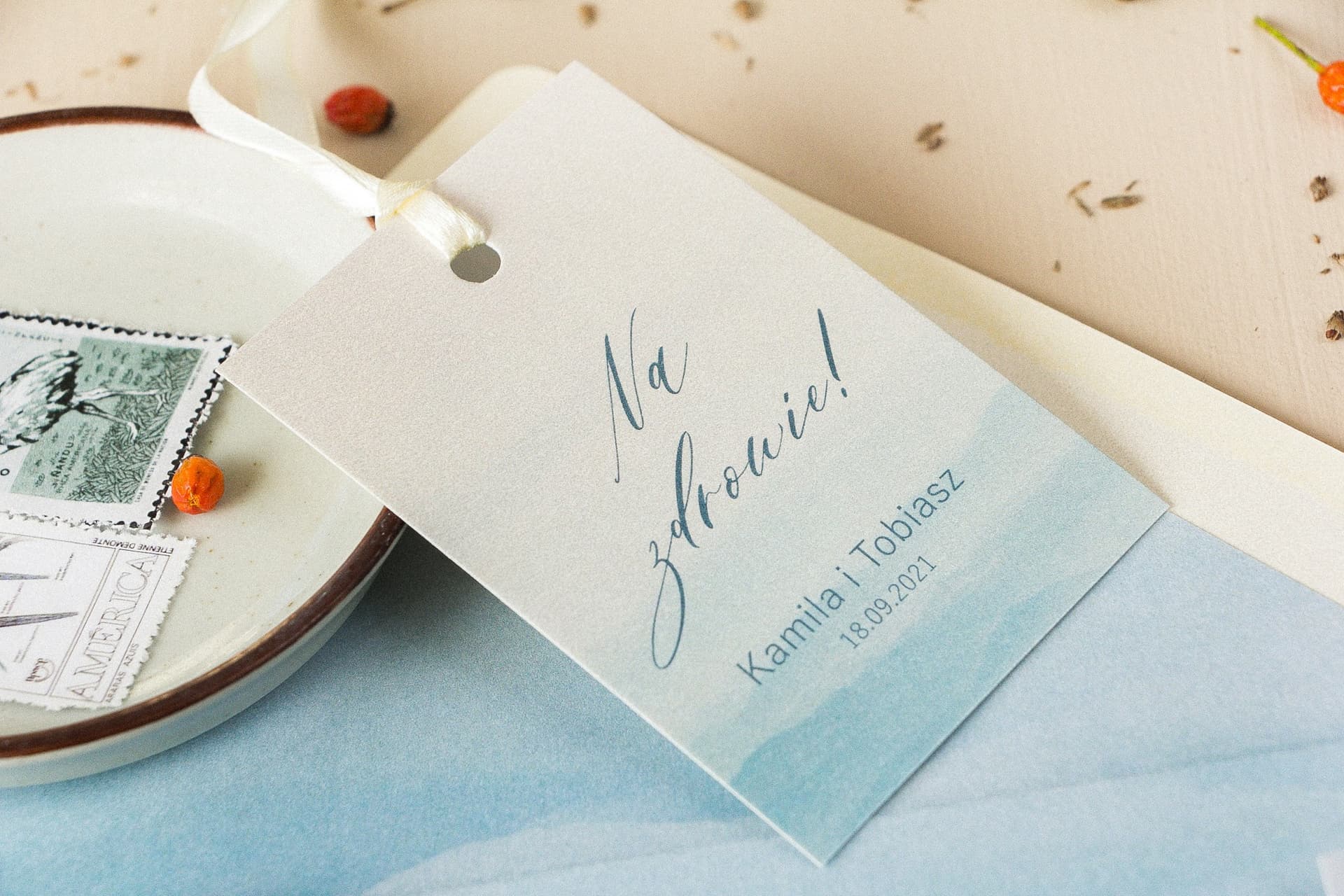 Dodaj odrobinę luksusu na weselny stół z naszymi eleganckimi zawieszkami na alkohol. Drukowane na ekskluzywnym, perłowym papierze ecru o gramaturze 300g, zachwycają delikatną, akwarelową grafiką. Każda zawieszka to małe dzieło sztuki, które podkreśli charakter Waszej uroczystości. Dzięki pełnej personalizacji tekstu i możliwości wyboru koloru tasiemki, stworzysz idealne dopełnienie aranżacji. Spraw, by każda butelka stała się wyjątkową ozdobą. Zamów swoje personalizowane zawieszki i zachwyć gości dbałością o detale!