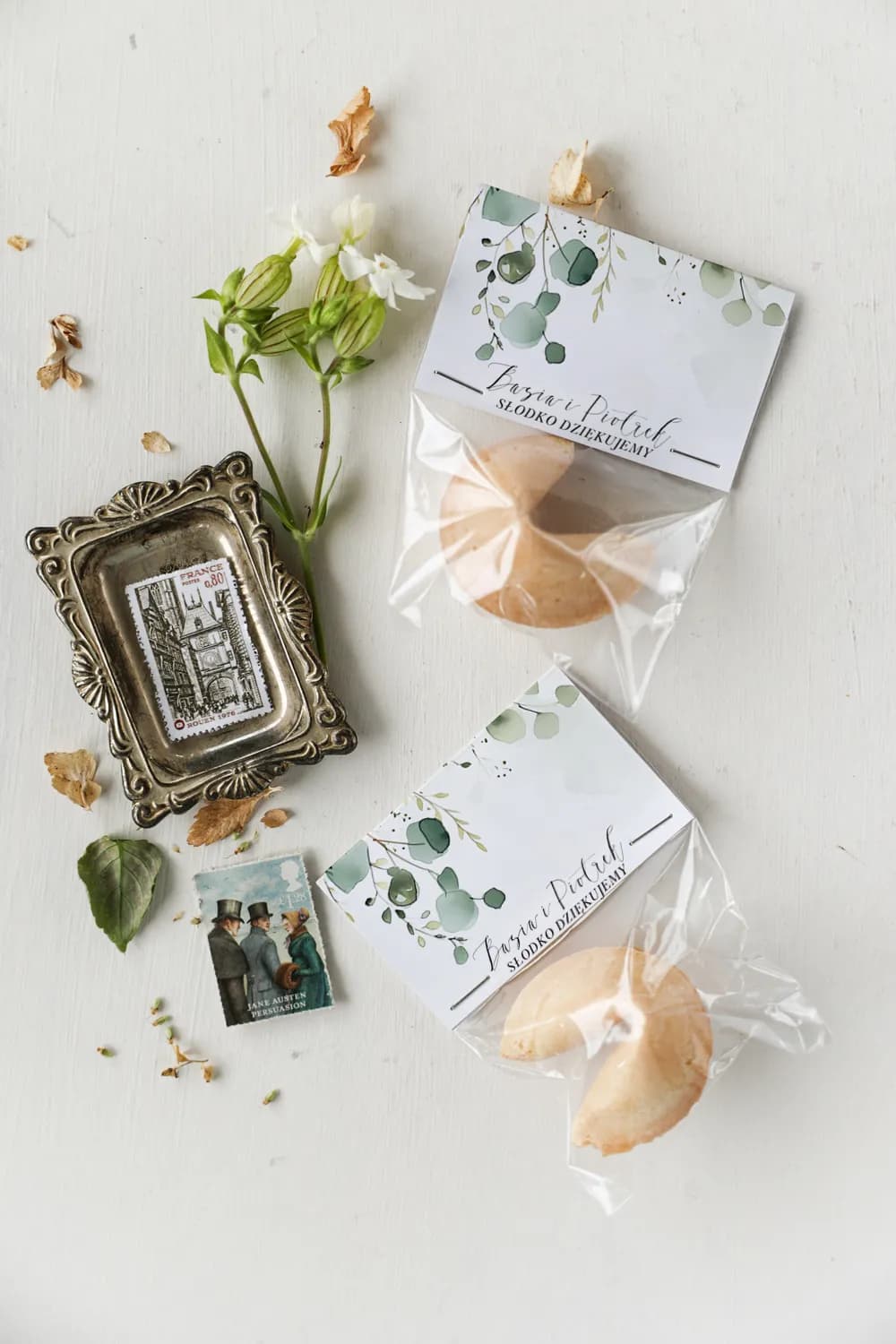 Oczaruj gości oryginalnym podziękowaniem weselnym – personalizowanym ciasteczkiem z wróżbą z botanicznym motywem eukaliptusa. To idealny upominek, który łączy w sobie elegancję, słodki smak i element zaskoczenia, idealnie pasując do stylu rustykalnego i greenery. Każde ciasteczko to nie tylko pyszny herbatnik, ale także ukryta wewnątrz, spersonalizowana wróżba. Zaprojektuj opakowanie z własnym tekstem i imionami w naszym darmowym kreatorze online. Podaruj swoim bliskim pamiątkę, która wywoła uśmiech!