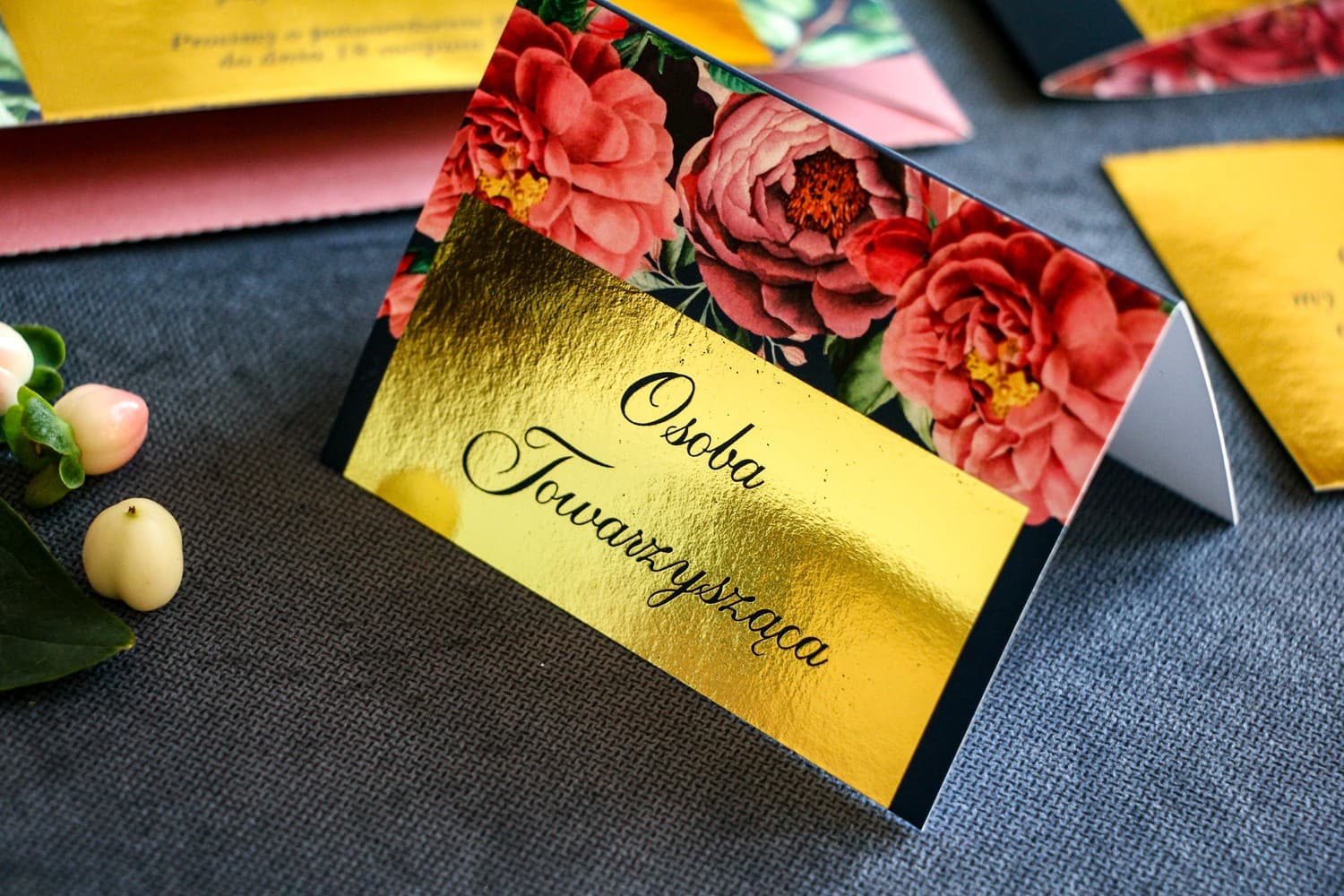 Wiemy, że w dniu ślubu liczy się perfekcja. Dlatego nasze złocone winietki glamour drukujemy na sztywnym, gładkim papierze satynowym o gramaturze 280g. Jego subtelne, matowe wykończenie doskonale komponuje się z błyszczącymi, złoconymi elementami, tworząc spójną i luksusową całość. Papier jest nie tylko piękny, ale również trwały i solidny, dzięki czemu winietki zachowują swój nienaganny kształt przez całe przyjęcie. Stojąca forma (tzw. daszek) o wymiarach około 10x7 cm po złożeniu gwarantuje doskonałą widoczność i stabilność na stole, jednocześnie nie przytłaczając pozostałych elementów dekoracji.
