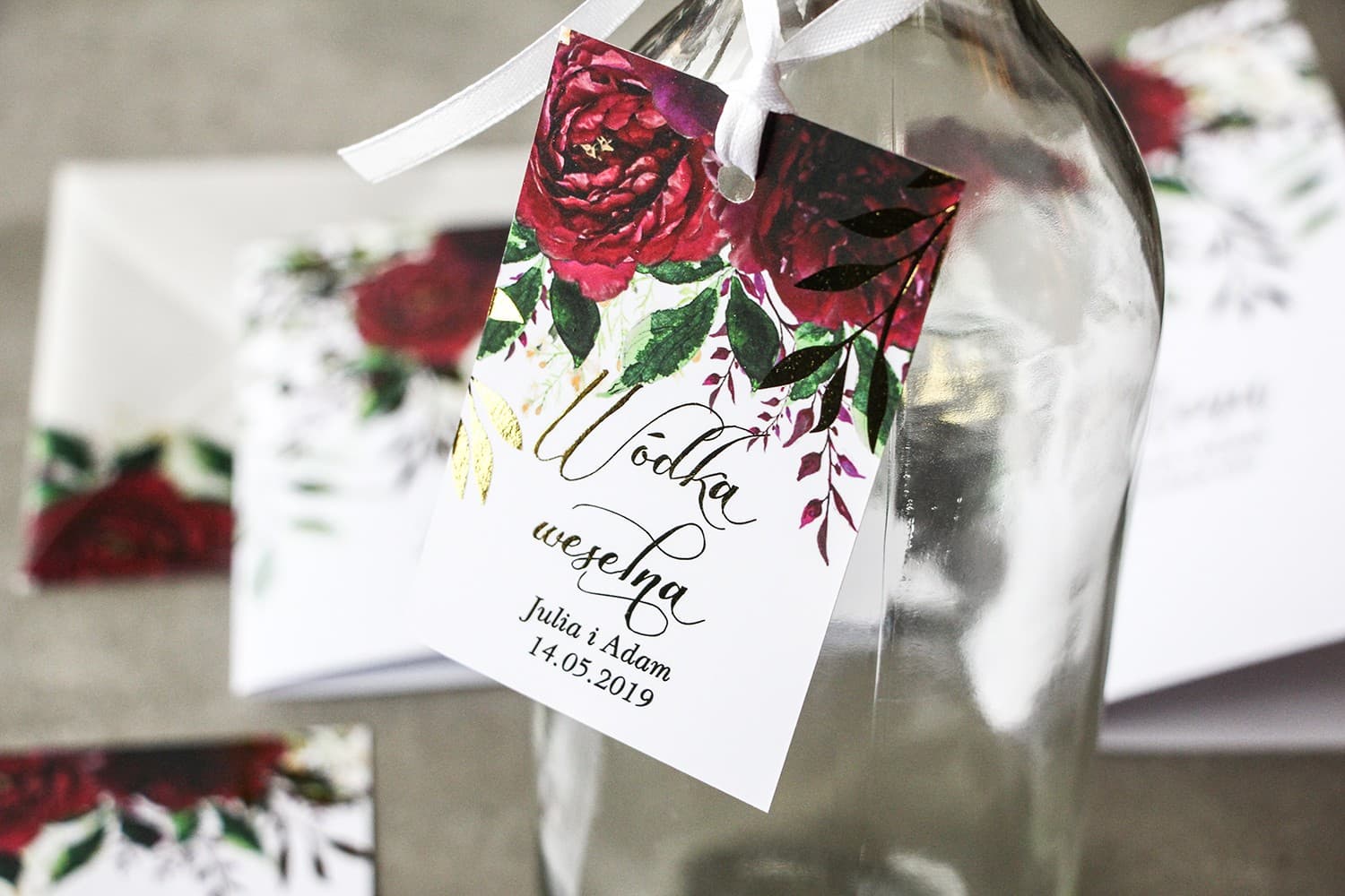 Kolekcja Rubin nr 3 została stworzona dla par, które nie boją się odważnych i eleganckich rozwiązań. Motyw bordowych piwonii to symbol szczęścia, miłości i pomyślności. W połączeniu ze złoconymi napisami, które pięknie odbijają światło, zawieszki stają się małym dziełem sztuki. Każda z nich drukowana jest na wysokiej jakości, grubym papierze satynowym o gramaturze 280g, co gwarantuje nie tylko piękny wygląd, ale i trwałość. Te eleganckie zawieszki na wódkę weselną to idealny wybór, by podkreślić wagę uroczystości i pokazać gościom, jak bardzo dbacie o detale. Taka oprawa butelek to prosty sposób, by nawet popularny alkohol prezentował się niezwykle szykownie.