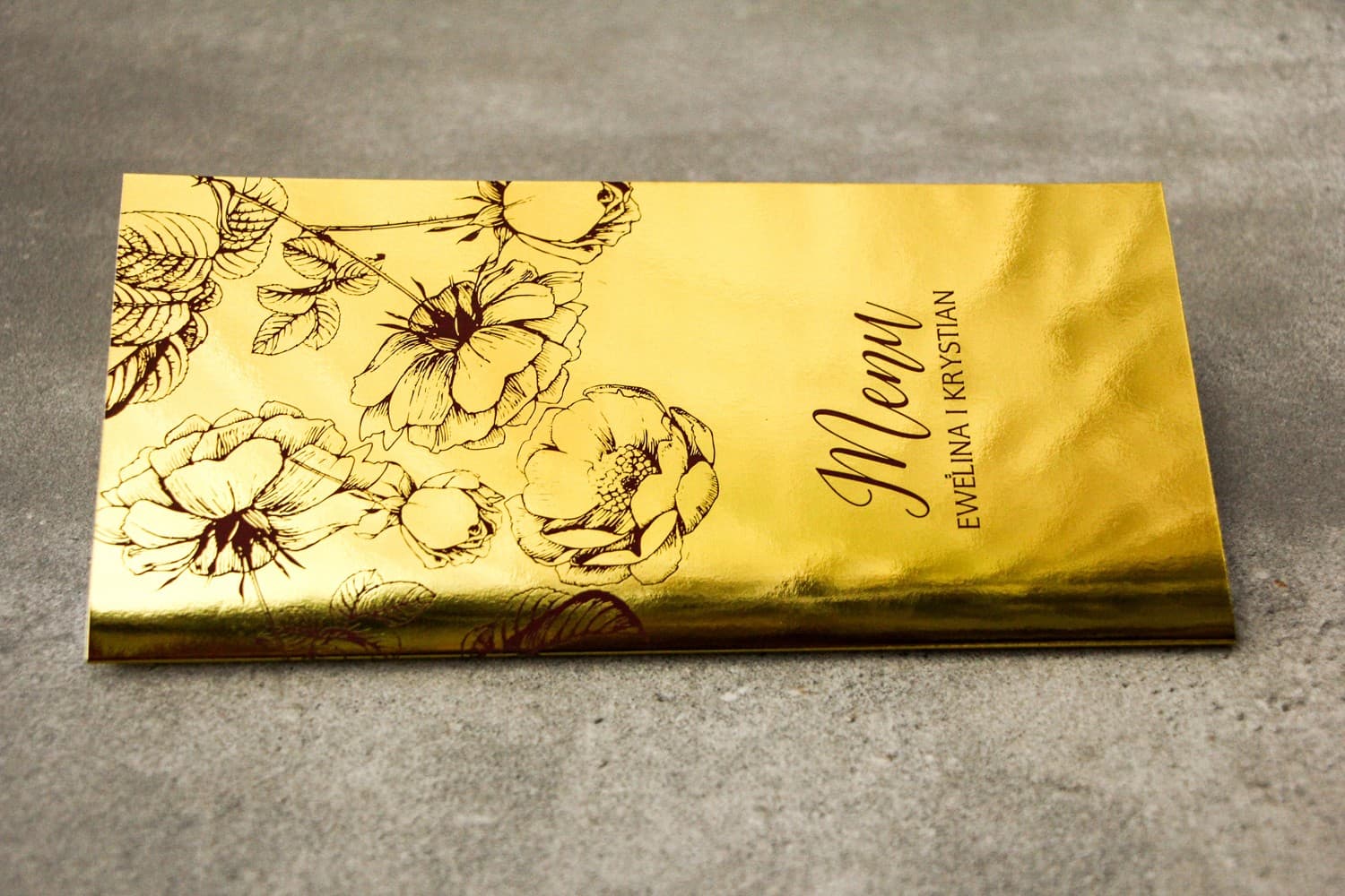 Złote Menu Weselne z Bordowymi Różami z Kolekcji Brilant Nr 4 to kwintesencja elegancji i wyrafinowanego stylu, dedykowana dla par ceniących sobie unikalność i luksus. Stworzone z myślą o najbardziej wyjątkowych chwilach, menu łączy w sobie klasę złocenia z głębią bordowych róż, tworząc niepowtarzalny akcent na weselnym stole.